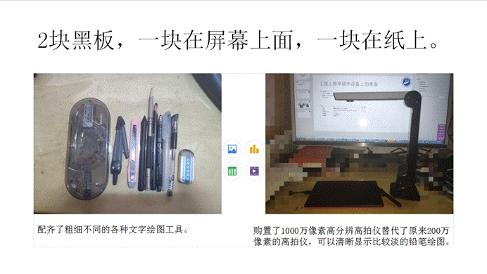 秦襄培老师首先以自己的授课经历向我们介绍了他的教学硬件设备上的准备。较好的电脑配置和网络环境,辅助线上教学工具,是顺利完成线上教学的基本保证。秦老师采用了I7电脑,1050级显卡,32寸显示器等,配置了1T的固态硬盘可以安静快速录视频。准备了线上线下2块黑板,屏幕上使用word版黑板可以在课件、ppt、pdf等文档上进行批注;纸上黑板配备了各种不同粗细的文字绘图工具。为了能够清晰显示比较的铅笔绘图,还购置了1000万像素的高拍仪代替原来200万像素的高拍仪;对于麦克风和摄像头,电容麦克风信号灵敏清晰,讲课声音如实传达;Xfinity摄像头自带4麦克风阵列。触屏笔记本电脑直接进行批注。为了有更好的授课效果,秦老师不断地自己动手进行各种设备上的尝试,如用手机支架夹装小型投影仪直投PPT到桌面;引入VR技术设备、手柄式3D扫描仪等。