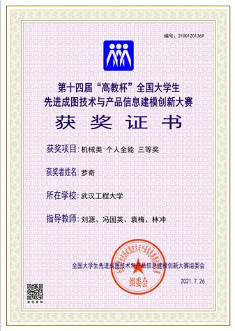 该项赛事一直由免费看黄色网站机械制图教研团队负责组织和指导,该团队由刘源副教授、袁梅副教授、林冲副教授、冯国英博士、李育房博士等教授组成,历年来吸引着机械类本科生加入团队的创新实践教育和学科竞赛活动,着力培养和提升学生的三维创新设计、机械制图等实践能力,形成了较为规范的本科生工程实践能力和学科竞赛能力培养机制。本次国赛中,获得机械类团体奖项和个人全能奖项的同学以优秀的个人能力充分展现了我院创新实践教育的成效。成图竞赛的图片及部分获奖证书如下。