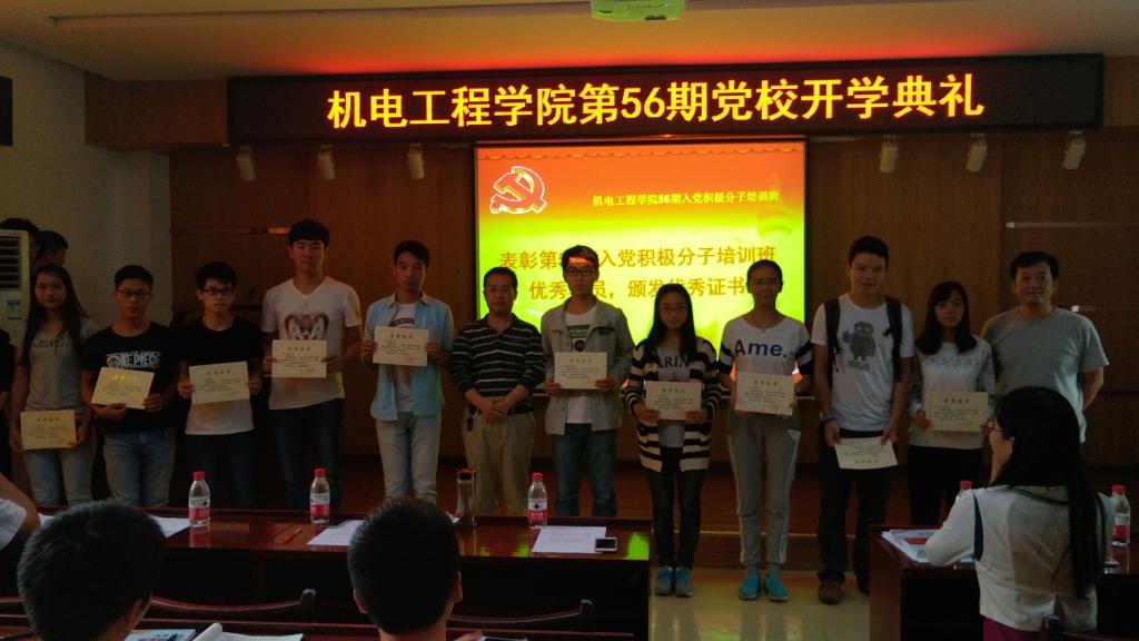开班典礼在庄严的《国际歌》歌声中拉开帷幕。院党委书记刘少洲老师和党委副书记李国林老师为第56期党校培训班优秀学员颁发荣誉证书。培训班班主任李念老师宣读了培训班纪律,要求大家一定要遵守纪律、认真学习、积极参加小组学习讨论、争取圆满完成本次培训。2015级机械类12班的张天宇同学作为本期学员代表发言。