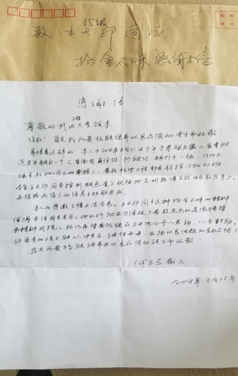 第二天上午何先生领取了钱包,面对失而复得的物品,何先生十分激动,当面感谢了学校教育培养了品德优秀的学生,随后还给学校送来了感谢信,才使得默默无闻做好事的王天印同学的拾金不昧事迹被大家所知晓,何先生对王同学拾金不昧的行为表示赞赏,希望更多年轻人传承中华传统美德。