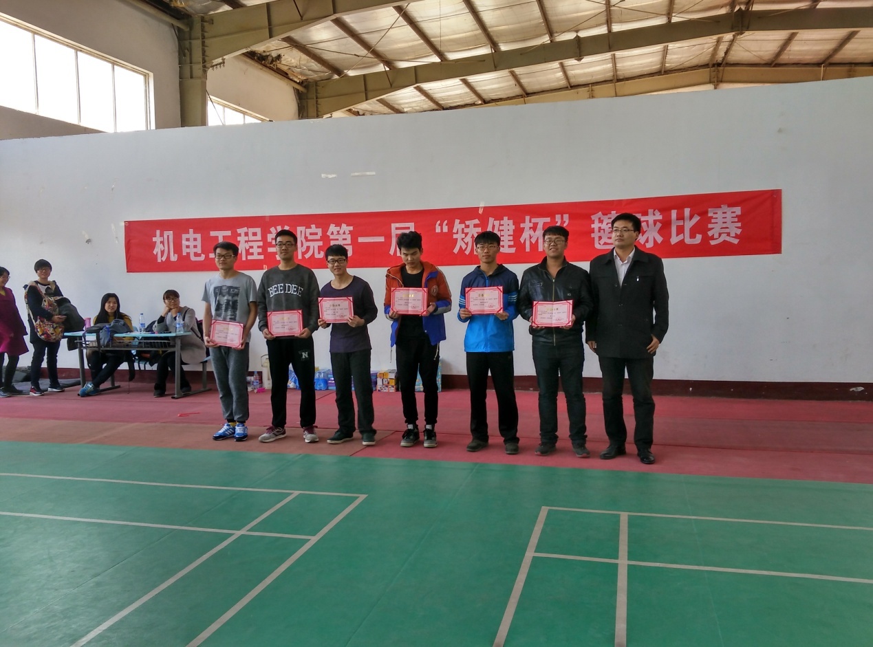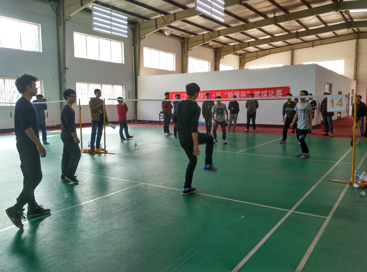 此次毽球比赛由学院各班级包含研究生组队参加,经过初赛、预赛、半决赛的激烈角逐,最后进军决赛的两支队伍分别是2014级机械13班代表队和2013级“小红毽”代表队。决赛紧张激烈,毽球在赛场上飞来飞去,两支队伍奋力竞争,场边观众直呼精彩。最终2013级“小红毽”代表队获得冠军,2014级机械13班获得亚军。决赛结束后,举行了“矫健杯”毽球比赛颁奖仪式,院团委副书记朱冬冬为获奖个人与集体颁奖。