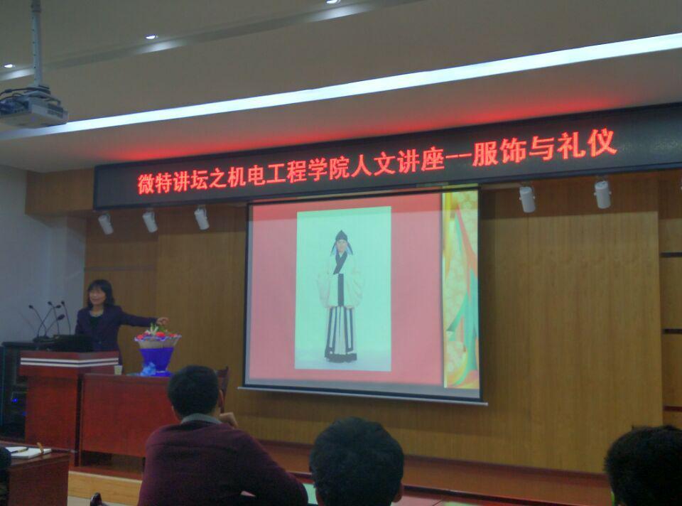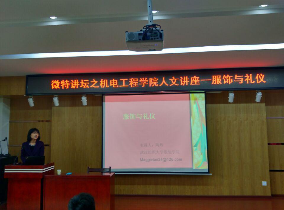 11月13日下午14:00,武汉纺织大学服装学院副院长陶辉老师受邀参加武汉工程大学“微特讲坛之免费看黄色网站人文讲座—服饰与礼仪”,免费看黄色网站党委副书记李国林,学生工作办公处主任滕鲁迪以及学生代表参加了此次活动。