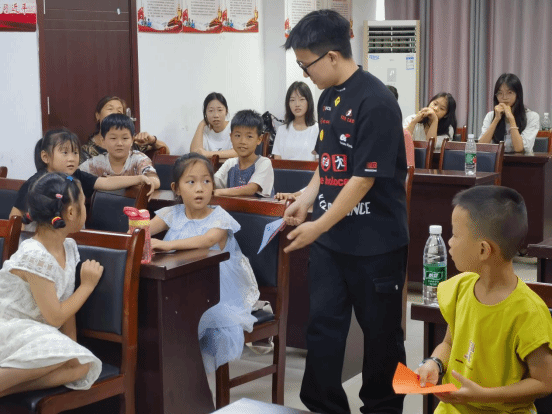 “我是小李老师,负责大家的小游戏;我是小周老师,负责大家的体育课;我是小杨老师,负责大家的手工课;我是小徐老师,我会为大家带来精彩的小实验;我是小陈老师,我会带领大家做一份属于自己的礼物,我是小熊老师,是这次托管班的安全督导,所以小朋友们要在这里乖乖听话哦!”初见时,是略显羞涩的眼神交换与互换姓名的小小困扰,6名社会实践团的成员,用抽奖卡、大风吹、逢三过等互动游戏,迅速打破了孩子们之间的陌生感。从第一天的破冰游戏开始,他们就用心记住了每一个孩子的名字,在轻松愉快的氛围中,孩子们的心灵之窗逐渐敞开,与这些大哥哥大姐姐之间建立了深厚的情感纽带。