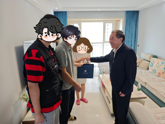 家访结束后,李志旭代表学校向小董一家赠送了融合校史文化的文创礼盒。印有学校标志的笔记本、徽章等纪念品,既展现了校园文化独特魅力,也寄托了对学生成长的殷切期望。