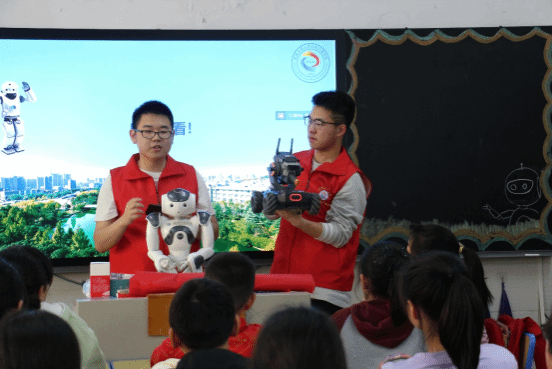 来自机器人工程专业的罗誉来同学围绕机器人的历史、机器人的发展以及机器人的应用,结合“NAO机器人”实物以及图文视频,带给孩子们视觉和触觉上的冲击和震撼。