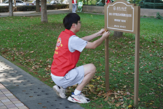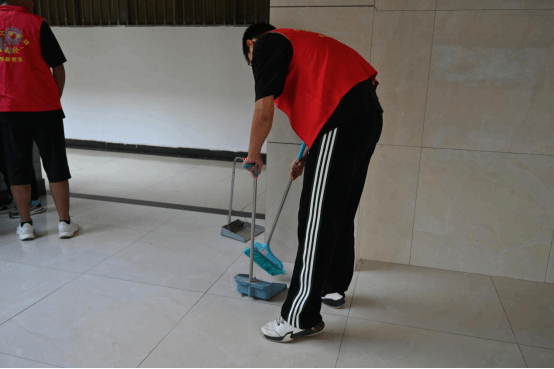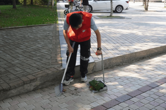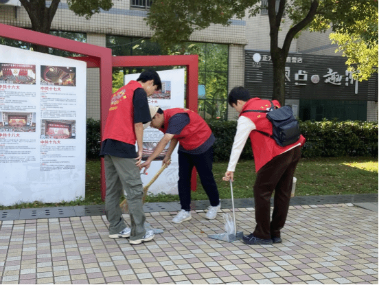 在微特钟楼思源广场上志愿者们热情洋溢、干劲十足,清扫垃圾、清除落叶、捡拾杂物、清理展板,精准务实的完成清洁工作。