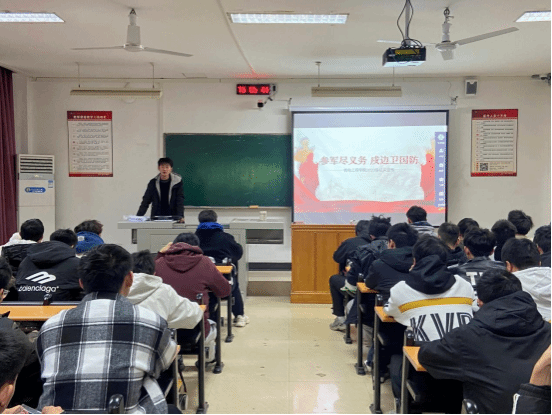 2022级辅导员、学院征兵工作联系人杨子航向同学们分享学院历年来征兵报名情况,并通过相关案例展示应征入伍对于大学生生涯发展的促进作用,了解了大学生入伍的各种优势,让同学们对大学生入伍有了新的认识。