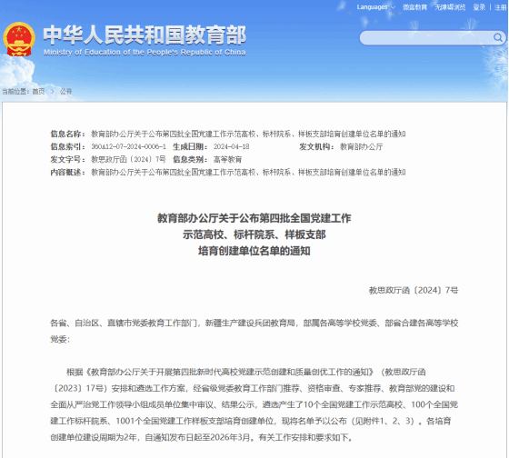截至目前,学院共获批培育创建“全国党建工作样板支部”2个、首批全省党建工作“样板支部”1个、全“先进基层党支部”1个、校“研究生样板党支部”(重点培育创建单位)1个,学院党委获评首批全省党建工作“标杆院系”。