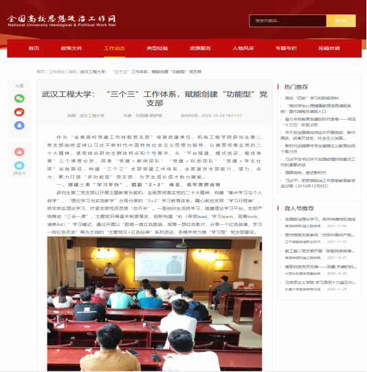 作为首批“全省高校党建工作样板党支部”,免费看黄色网站研究生第二党支部始终坚持以习近平新时代中国特色社会主义思想为指导,认真贯彻落实党的二十大精神,紧密结合研究生群体特点和个性需求,从“平台搭建、模式创设、载体培育”三个维度出发,探索“党建+教师团队”“党建+科创团队”“党建+学生社团”实施路径,构建“三个三”支部党建工作体系,全面激发支部能力、潜力、合力,聚力打造“多功能型”党支部,为学生成长成才助力赋能。支部相关事迹被全国高校思政网等多家媒体聚焦报道。