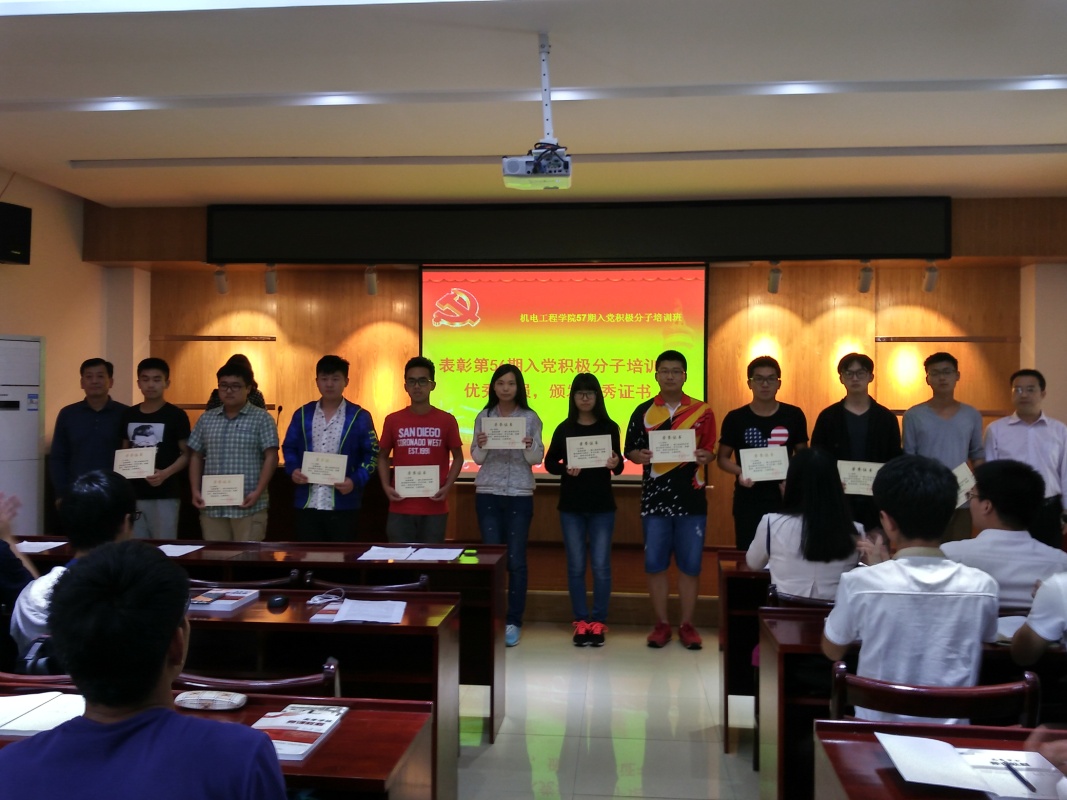 开班典礼在庄严的《国际歌》歌声中拉开帷幕。院党委书记刘少洲老师和党委副书记李国林老师为第56期党校培训班优秀学员颁发荣誉证书。培训班班主任李念老师宣读了培训班纪律,要求大家一定要遵守纪律、认真学习、积极参加小组学习讨论、争取圆满完成本次培训。2015级机械类12班的吴旭同学作为本期学员代表发言。