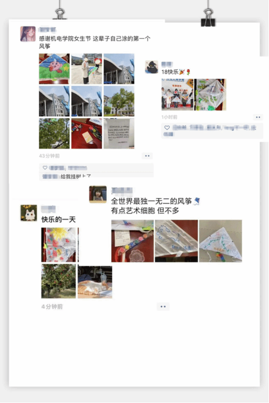 “感谢机电学院女神节,这辈子自己涂的第一个风筝!”“快乐的一天”“全世界独一无二的风筝”女孩们带着自己的创意风筝在学院各个标志性地点打卡拍照,留下自己的青春印迹,感受到校园文化的魅力所在,同时也在朋友圈中分享这份独特的喜悦。