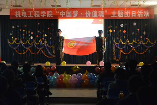 本次活动分为三个篇章进行,分别是“共在团旗下”、“向青春呐喊”、 “我的祖国我的梦”。第一篇章“共在团旗下”由团旗护卫队护送团旗入场,在全场高唱共青团团歌声中拉开序幕,场面庄严肃穆,体现了我院全体师生对共青团的拥护与热爱;诗朗诵《从我心底深爱我的祖国》体现了机电学院学生对祖国的深深热爱;小品《我们都是共青团员》在学生们的朗朗笑声展示了学生们对团组织的向往和信赖。第二篇章“向青春呐喊”由舞蹈《一刀不剪》展开,充分体现了机电学院同学们青春活泼的一面。歌曲《奔跑》更是向观众展示了机电学院的学生勇敢无畏一往无前的精神。第三篇章“我的祖国我的梦”中别样的《军装秀》给台下观众带来了耳目一新的视觉盛宴;晚会的压轴节目大合唱《国家》更是以磅礴的气势感染了台下所有观众,学生们挥舞着印有社会主义核心价值观的大字,全体观众起立鼓掌,现场气氛达到了高潮。
