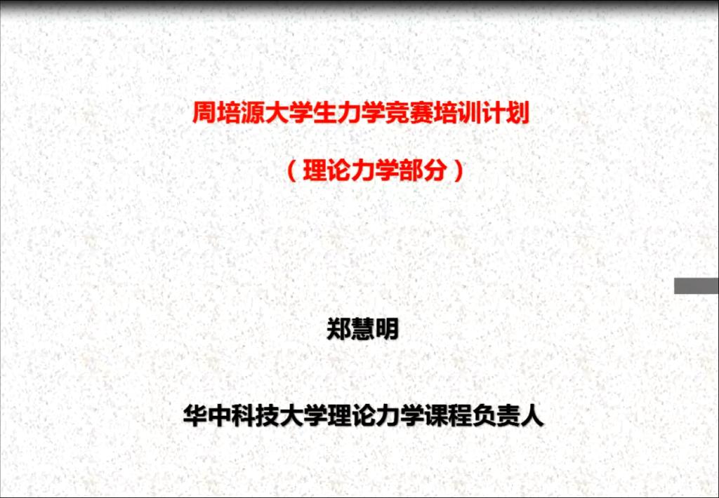 华中科技大学郑慧明老师就备赛情况进行讲解。郑慧明老师简要介绍了考试内容和时间,往届获奖情况,竞赛考试的分值分布及难度和获国奖、省奖的要求,理论力学培训目标和获奖难度等同学们十分关注的重点问题,并对理论力学培训计划以及培训学习中的主要内容和重难点知识进行了概述,对同学们能力的提升提供了有效助力。