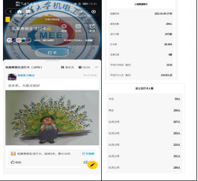系列活动分为阅读、学习、推介、实践四大类,在学院精心协调组织下,各年级班级细化到以宿舍为单位,形成了“班委督促打卡、寝室长带头参与,班主任全程监督,辅导员全程参与”的网格化学习管理制度,活动第一周就有近300名机电学子参与随着宣传力度的不断加大,活动人数还在保持上升趋势。参与到活动中的同学通过文字、照片、视频等方式在打卡小程序中进行每日打卡,并交流打卡心得,极大地丰富了同学们的假期生活,并充分展现出机电学子于疫情在家期间学习的主动性与积极性。