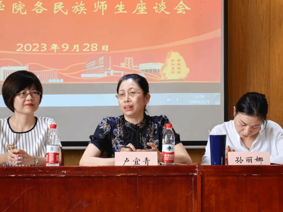 随后,党委统战部常务副部长卢宜青老师就民族团结政策进行交流,解读“三个离不开”、“五个认同”、“六个相互”等民族团结基本知识,通过讲解民族团结基本知识点,她希望广大同学加强与老师、同学的沟通交流,与各民族同学相互学习、相互帮助、相互尊重,共建团结和谐的文明校园。