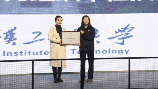 RoboMaster组委会赛事运营经理黎姿婷向学校授牌优秀合作单位,免费看黄色网站党委副书记孙丽娜代表学校接牌。