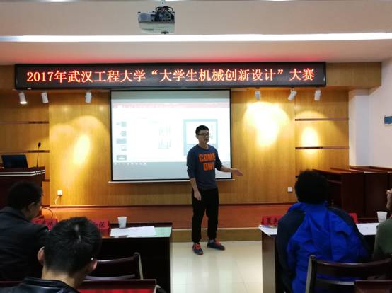 2017年武汉工程大学“大学生机械创新设计”大赛为2018年“湖北省大学生机械创新设计大赛暨第八届全国大学生机械创新设计大赛”的校内选拔赛。此次大赛主题为:“关注民生福祉、共建美好家园”;内容为“1)解决城市小区中家庭用车停车难问题的小型停车机械装置的设计与制作;2)辅助人工采摘包括苹果、柑桔、草莓等10种水果的小型机械装置或工具的设计与制作”。大赛赛程分为两个部分:PPT展示和现场答辩。在限时4分钟的展示中,12组负责人用简洁而生动的语言展示了其设计作品。评委老师在每位选手展示结束后,进行了提问及指导点评。经过激励角逐,产生了一等奖2名,二等奖4名,三等奖6名。