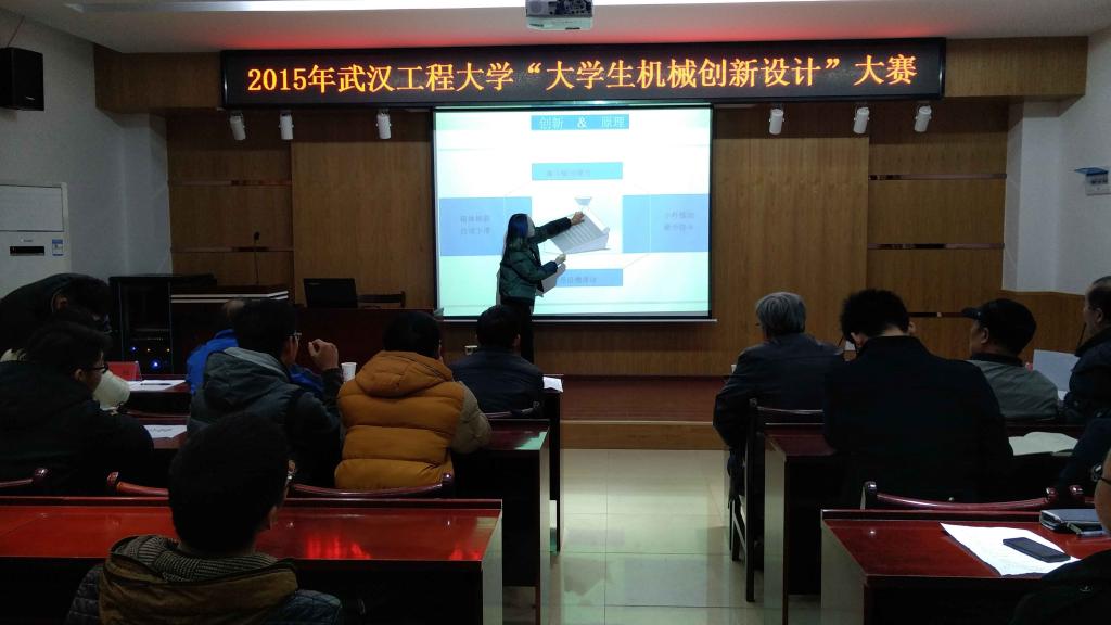 2015年武汉工程大学“大学生机械创新设计”大赛为2016年“湖北省大学生机械创新设计大赛暨第七届全国大学生机械创新设计大赛”的校内选拔赛。此次比赛主题为:“服务社会——高效、便利、个性化”;内容为“钱币的分类、清点、整理机械装置;不同材质、形状和尺寸商品的包装机械装置;商品运载及助力机械装置”。大赛赛程分为两个部分:PPT展示和现场答辩。在限时4分钟的展示中,15组选手将自己团队的智慧结晶用简洁而生动的语言展示了其设计作品。评委老师在每位选手展示结束后,进行了提问及指导点评。选手们受益颇多,并感谢了老师的教导。经过激励角逐,产生了一等奖5名,二等奖6名,三等奖4名。
