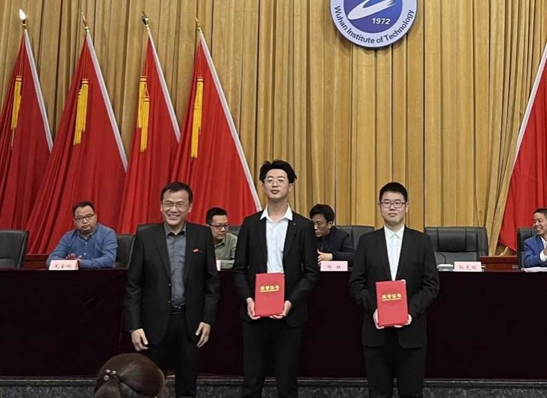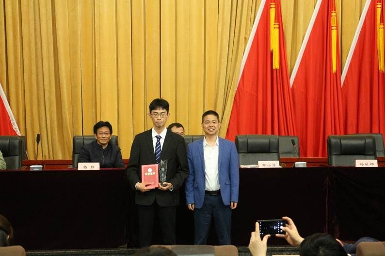 创新创业学院院长孙先明为获得第八届中国国际“互联网+”大学生创新创业大赛金牌项目的参赛代表杨明杰,以及第十七届“挑战杯”全国大学生课外学术作品竞赛一等奖项目的参赛代表张余豪颁奖。