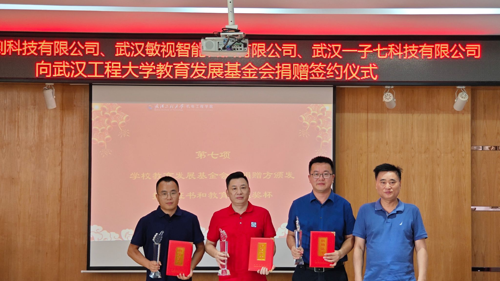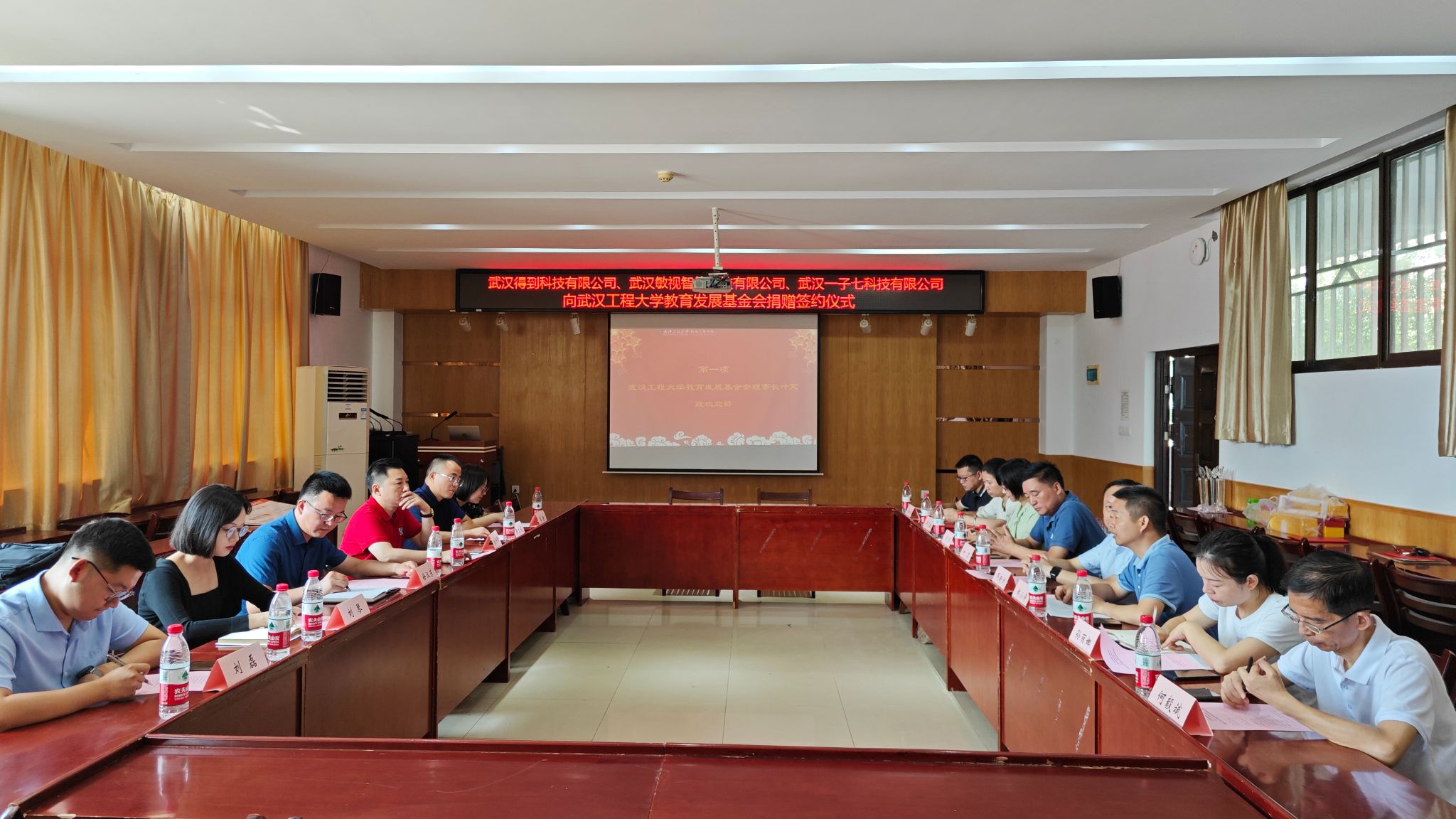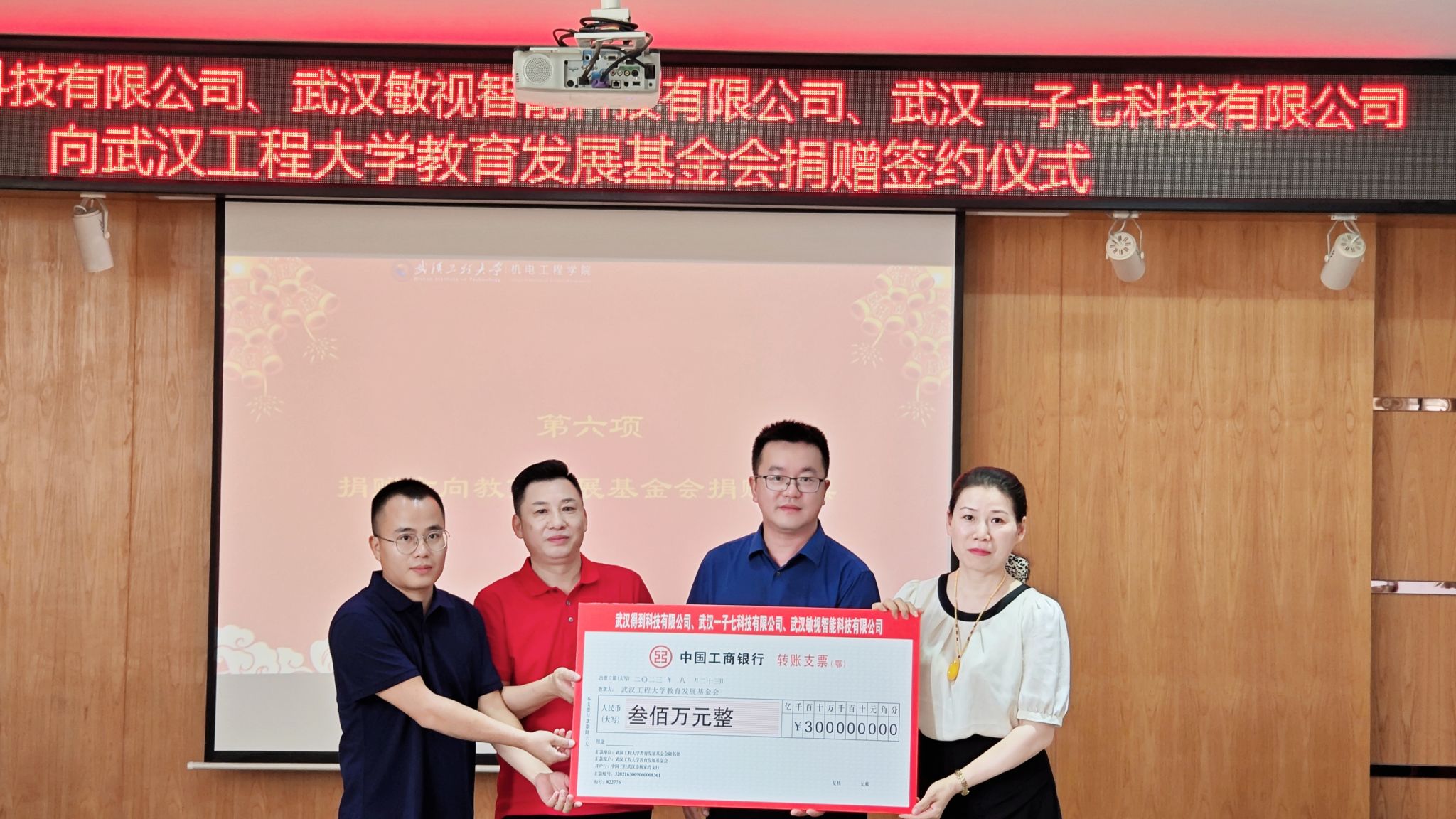 (通讯员 蔡超)8月23日上午,武汉得到科技有限公司、武汉敏视智能科技有限公司和武汉一子七科技有限公司三家企业联合向学校捐赠300万元用于机电学院实践教学项目建设,签约仪式在免费看黄色网站205会议室进行。武汉工程大学正校级干部、教育发展基金会理事长叶芃和三家企业代表徐汉东先生、朱兵明先生、鲁文成先生出席仪式,学校校友工作与合作发展处、免费看黄色网站主要负责人及相关人员参加会议,仪式由教育发展基金会副理事长、秘书长邓新洲主持。