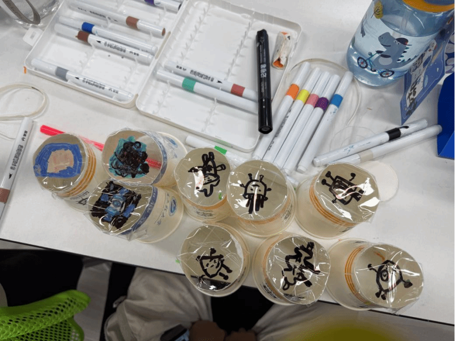 “纸杯投影仪”实验聚焦日常生活中的物理现象。孩子们用纸杯、保鲜膜和马克笔制作简易投影装置,通过调整图案与光源的距离,在墙面投射出放大的影像,孩子们发挥创意,在投影膜上绘制星座、动物等图案,用自制装置上演了一场“迷你光影秀”,在欢声笑语中深化了对光学原理的认知。