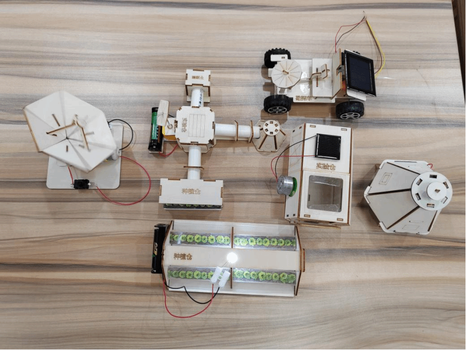 “火星生存”为情境,组织“火星基地”设计活动中,孩子们利用纸箱、吸管、彩泥等材料,结合实践团成员讲解的行星环境知识,分组搭建包含“种植仓”“实验仓”“睡眠仓”“探测车”的基地模型。活动中,实践团成员引导孩子们考虑火星低重力、强辐射等环境因素,将科学知识转化为创意设计——有的小组为基地加装“太阳能板”,有的则设计了“地下避难所”,展现了孩子们将科学想象转化为实践的能力。