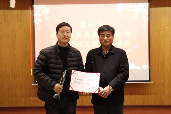 理事长叶芃代表学校教育发展基金会向捐赠方颁发了捐赠证书和教育贡献奖杯。
