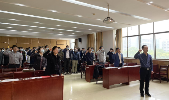 院长陈绪兵带领大家重温入职宣誓,并签订了《武汉工程大学教师师德师风承诺书》,随后,老师们一一对照《新时代高校教师职业行为十项准则》和《武汉工程大学师德师风负面清单及师德失范行为处理办法》进行了深入自查,填写《自查表》,检视问题、自我警示。