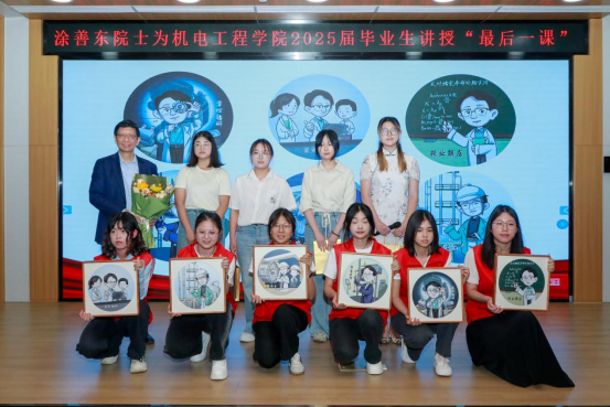 为表达对涂院士的崇敬与感恩之情,我校艺术设计学院师生代表以其教书育人、潜心科研及解决重大工程难题经典形象绘制卡通画作“最后一课”结束后,学生代表将六幅画作献给涂善东院士涂院士回赠由其亲笔签名的文创产品,并激励同学们坚守初心、勇于创新,为国家科技发展贡献力量。