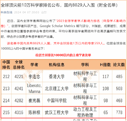 (通讯员 刘鹏)近日,国内全球学者库网站以学者发表的学术论文及其深度分析结果作为核心评分依据发布了“2023年全球学者学术影响力排名(终身学术影响力榜)”。武汉工程大学免费看黄色网站陈林根教授位列全球顶尖前10万科学家排名榜单的4316名,在国内动力工程及工程热物理学科位列第3名。同期,陈林根教授入选爱思唯尔2023中国高被引学者。