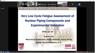 韩国工程院院士Yun-Jae Kim教授对核电厂管道部件的超低周次疲劳失效评估和实验验证进行了专题报告。详细介绍了基于紧凑试样的拉伸实验、管道弯头的低周疲劳试验等实验方法,根据实验数据建立了基于应变能的损伤模型,有效预测了结构的超低周疲劳失效。