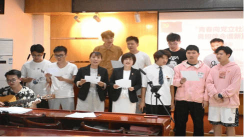 在支部成员风采展示环节中,刘老师与部分支部党员带来合唱歌曲《年轻人的心声》,刘老师以歌曲中“蝴蝶必定经过蛹的挣扎,才会有对坚实如画的翅膀”的这一句歌词勉励大家不畏磨难,化茧成蝶;支部党员胡柏林结合亲身经历与时事热点为大家表演了一场脱口秀,形式创新灵活、内容诙谐幽默,引得同学们阵阵叫好;支部积极分子肖荣耀为大家带来了吉他弹唱,指尖音符飞舞,悦耳的歌曲为同学们带来了美妙的享受;歌曲串烧、舞蹈展示、个人独唱...同学们在挥洒热情、激发活力的同时,尽情施展个人才艺,为全体师生呈现了一场别样精彩的演出盛会。最后,活动在《海阔天空》的合唱中圆满落下帷幕。