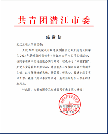 (通讯员 万浩天)近日,我校团委收到来共青团潜江市委员会的感谢信,对机电学院2021级机械设计制造及其自动化专业的赵逸云同学在潜江市大学生实习实训活动中的优异表现表示衷心感谢。该同学在潜江市泰丰街道经服办实习期间,积极参与“希望家园”、关爱儿童等暑期公益活动,并协助办公室撰写多篇民意调查文稿,以实际行动解民忧、纾民困、暖民心,圆满完成了实习工作,赢得了实习单位的认可,展现出新时代大学生的青春风采。