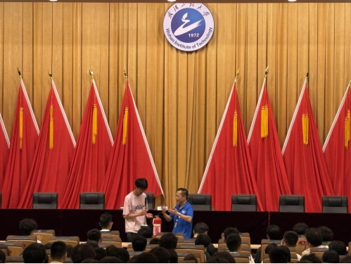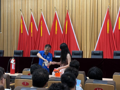 保卫处王子龙以“大学安全教育”为主题,结合宿舍消防安全视频直观展示火灾发生的原因及危害,同时请新生现场模拟使用灭火器和过滤式消防面罩,让消防安全知识从“听”变为“练”,切实提升新生风险防范能力。
