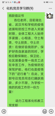 在疫情进展和防控的关键时期,支部成员在做好自我防护、保护好各自家庭的同时,及时开展募捐活动,助力学校疫情防控。正如捐款倡议书中所说:全体工程大人手紧握、心相连,守土有责,守土担责,守土尽责!疫情防控,人人有责!支部合计捐款5000元,转给学校新型冠状肺炎防控援助专项基金,用于学校一线的疫情防控工作。